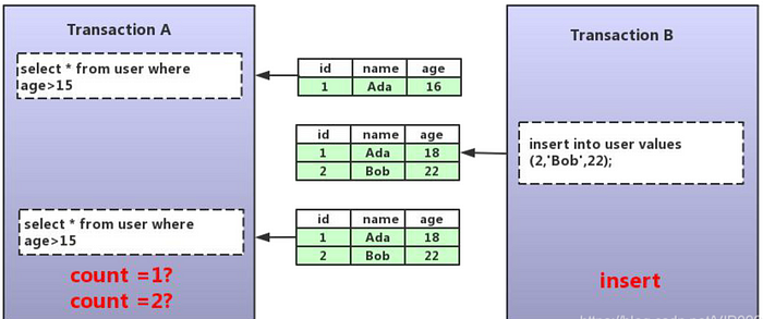 'Phantom Read'는 한 트랜잭션 내에서 일관된 조회를 보장하지 못하는 경우 발생합니다. 예를 들어, 트랜잭션 A가 특정 조건에 맞는 데이터를 조회하고, 그 사이에 트랜잭션 B가 같은 조건을 만족하는 새로운 데이터를 삽입하고 커밋한다면, A가 같은 조건으로 데이터를 다시 조회했을 때 처음에는 없던 데이터가 조회되는 현상입니다.