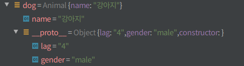 간단하게 보면 Animal이라는 생성자를 만들고 그 후 프로토 타입으로 lag와 gender를 프로토타입으로 생성
